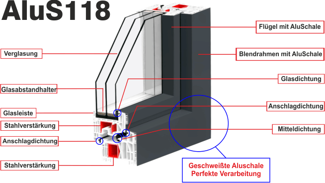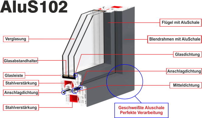 Noch nie war es so einfach, die Vorteile und Stärken von Aluminium und Kunststoff zu vereinen. Außen bietet die Aluminium-Vorsatzschale perfekten Schutz bei allen Witterungseinflüssen und eine nahezu unbegrenzte Farb-gestaltung in RAL Farben. Das innen liegende Kunststofffenster-Profil überzeugt durch eine ausgesprochen angenehme Optik. Die innovative, dauerhafte Klebeverbindung der Alu-Vorsatzschale mit dem Kunststofffenster schafft ein hohes Maß an Sicherheit, Langlebigkeit und Stabilität.