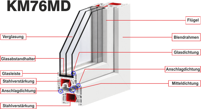 - Mitteldichtung: Mitteldichtungssysteme normalerweise nur mit drei Dichtungen an und sorgt dadurch für eine weitere Verbesserung der Wärmedämmung.
