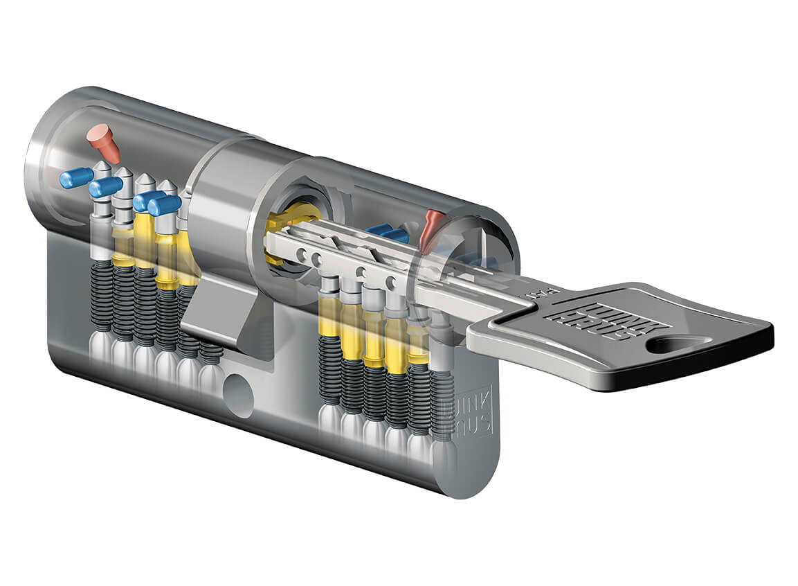 Das Schließsystem P12RS ist mit dem patentierten* Schlüsselanschlag im Zylinder und Schlüssel ausgestattet.
